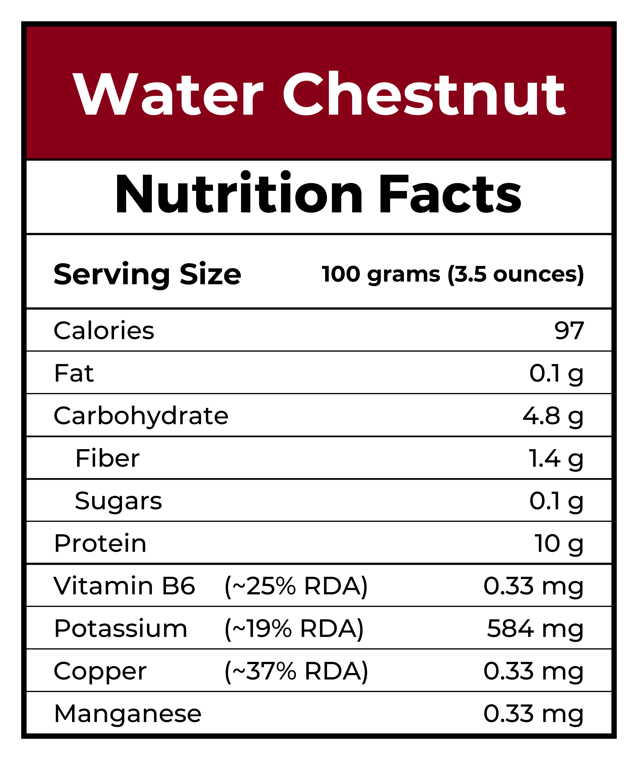 Fiber matters too, and each serving of water chestnuts contains 3 grams (12% of the RDA). Dietary fiber can, depending on the person, help with digestion, improve cardiovascular risk markers, and promote fullness[*][*].