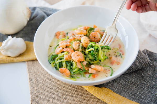 This keto shrimp alfredo with zoodles makes a perfect low-carb comfort food dish. Zucchini noodles smothered in dairy-free alfredo sauce with shrimp and garlic.
