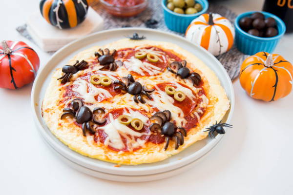 This halloween spider pizza makes a perfect meal pre-trick-or-treating. Grab your olive spiders, mozzarella cheese, pizza sauce, and DIY pizza crust.
