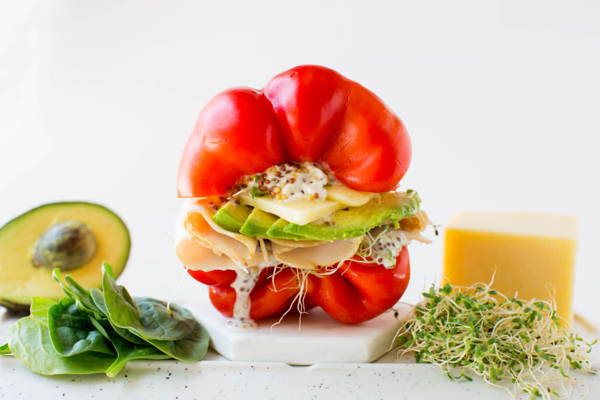 This bell pepper sandwich works for your keto diet, as well as paleo and gluten-free. The red bell pepper is crunchy and sweet, and prep time is only five minutes.