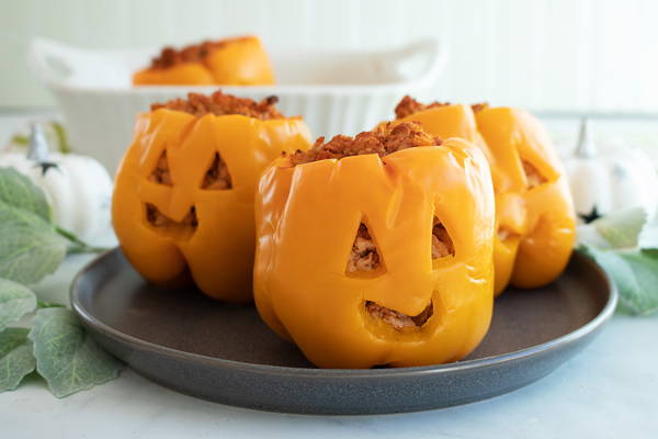 Grab some orange bell peppers, ground beef, spices, and a paring knife -- it's time to make some festive Halloween stuffed pepper jack o' lanterns.