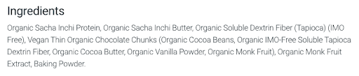 • Vegan Thin Organic Chocolate Chunks (made from organic cocoa beans, organic IMO-free soluble tapioca dextrin fiber, organic cocoa butter, organic vanilla powder, organic monk fruit extract)