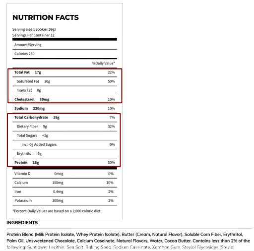 Though they come in peanut butter and double chocolate chip flavors, here’s what a regular chocolate chip Quest cookie contains[*]: