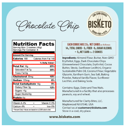 Two BisKeto sugar-free chocolate chip cookies will add[*]: