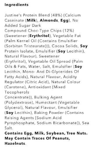 • Justine’s Protein Blend (Calcium Caseinate (Milk), Almonds, Egg)