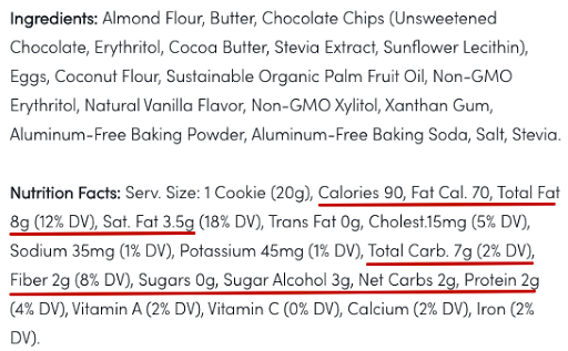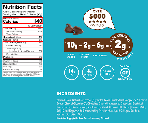 BisKeto boasts the highest net carb count of all the keto cookies on this list. That and the vegetable glycerin have us looking for better options.
