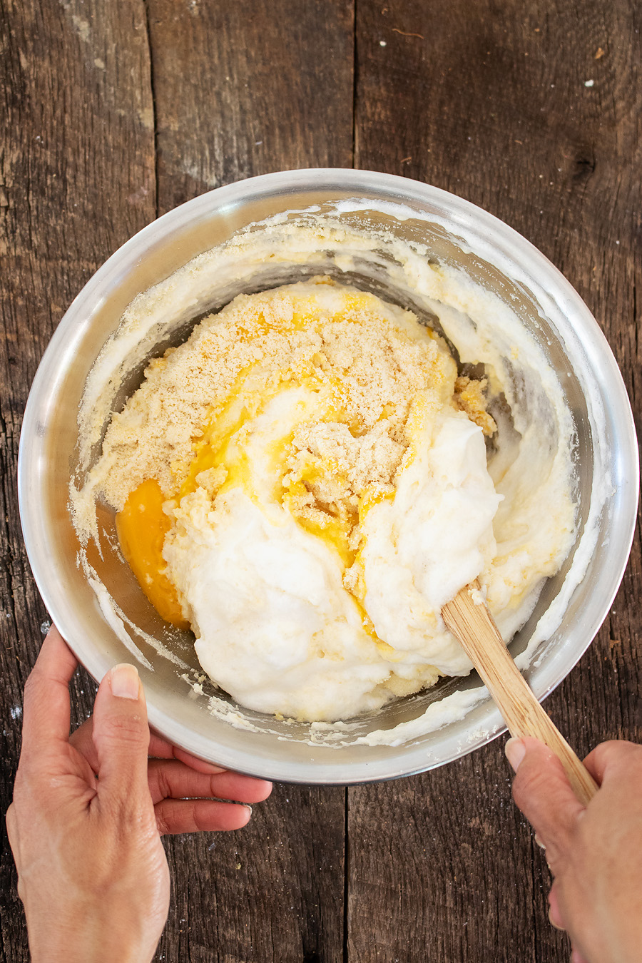 - Combine: Add apple cider vinegar and melted butter to egg yolks and whisk well. Add dry ingredients and 1/2 of the egg whites. Slowly fold together, then add remaining egg whites and mix just until combined.