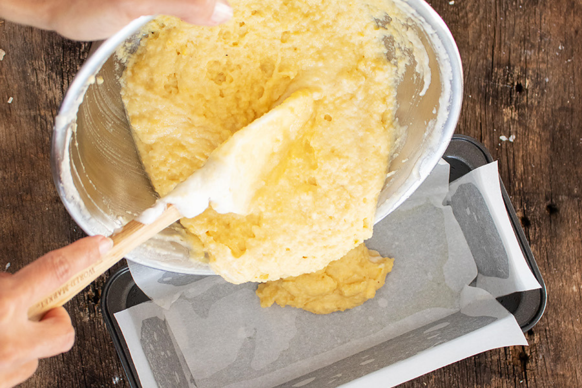 - Preheat the oven to 375°F and line an 8×4 loaf pan with parchment paper or coat with non-stick spray. Set aside.