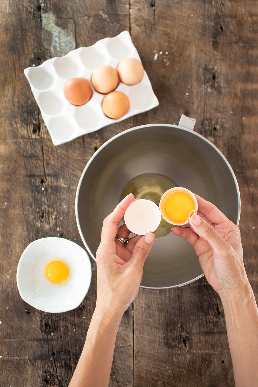 - Separate eggs into two bowls. Place the whites in a large clean bowl or stand mixer and add the eggs to a separate bowl.