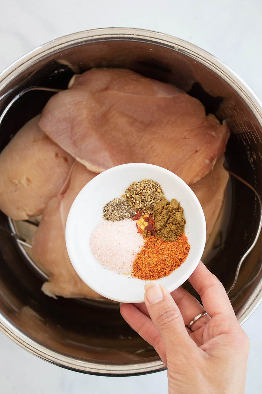 - Cooking liquid: Adding liquid prevents burning in the Instant Pot and adds moisture to your chicken. You can choose any type of broth (chicken broth, beef broth, bone broth).