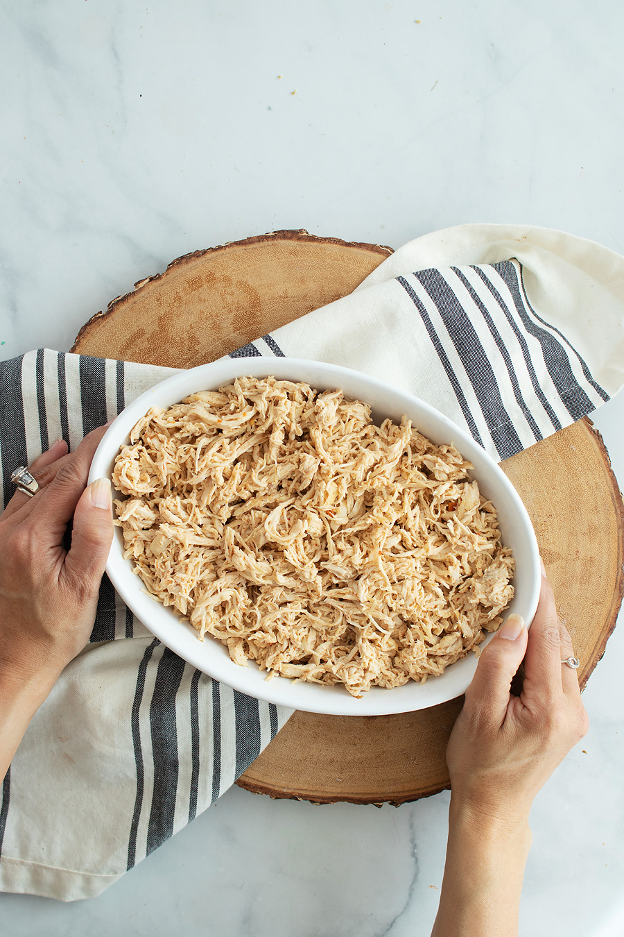 - Type of chicken — you could go with boneless skinless chicken breasts or chicken with bone-in. The only difference will be that it’s a bit harder to shred chicken that has a bone.