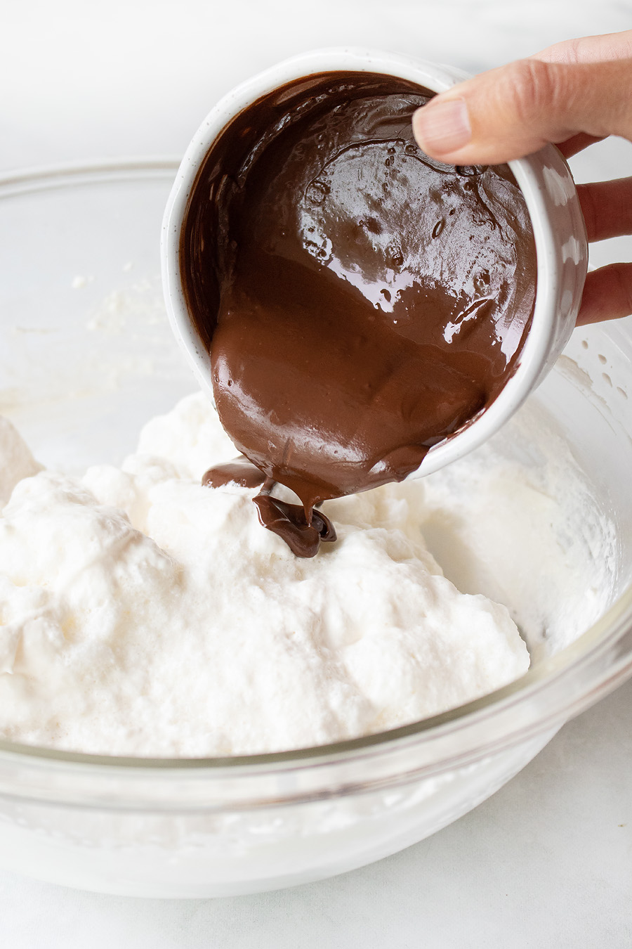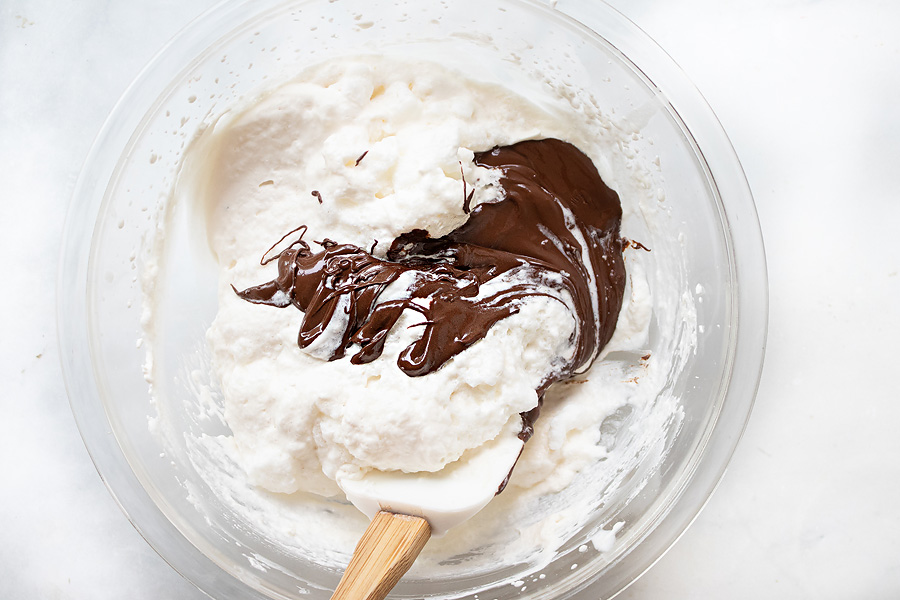- When combining the egg whites, heavy cream, and chocolate be very gentle while folding together.