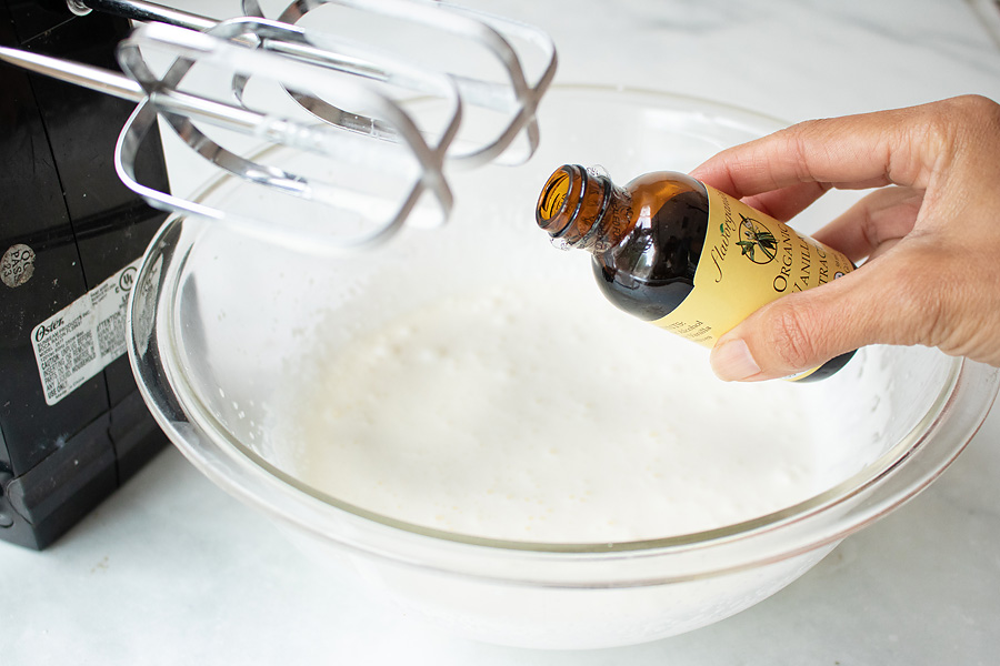 - In the other large bowl, add the heavy cream, vanilla extract, and espresso powder. Beat on high for 1-2 minutes until light and fluffy. Beat to stiff peaks. Place bowl in fridge.