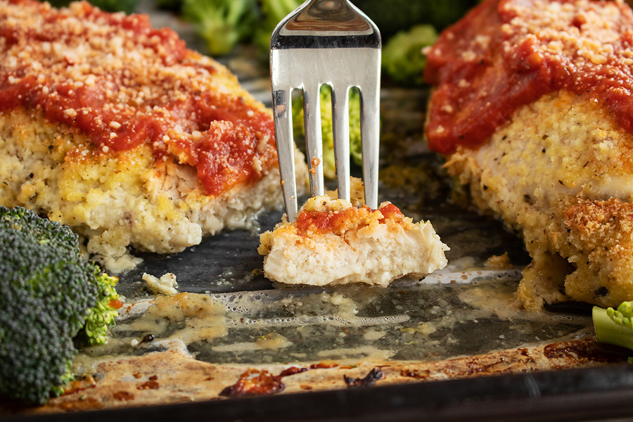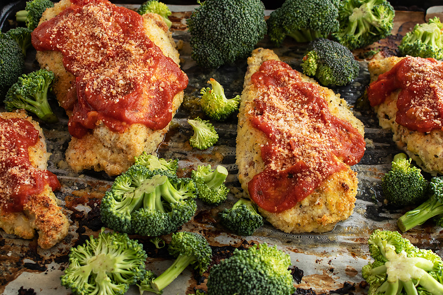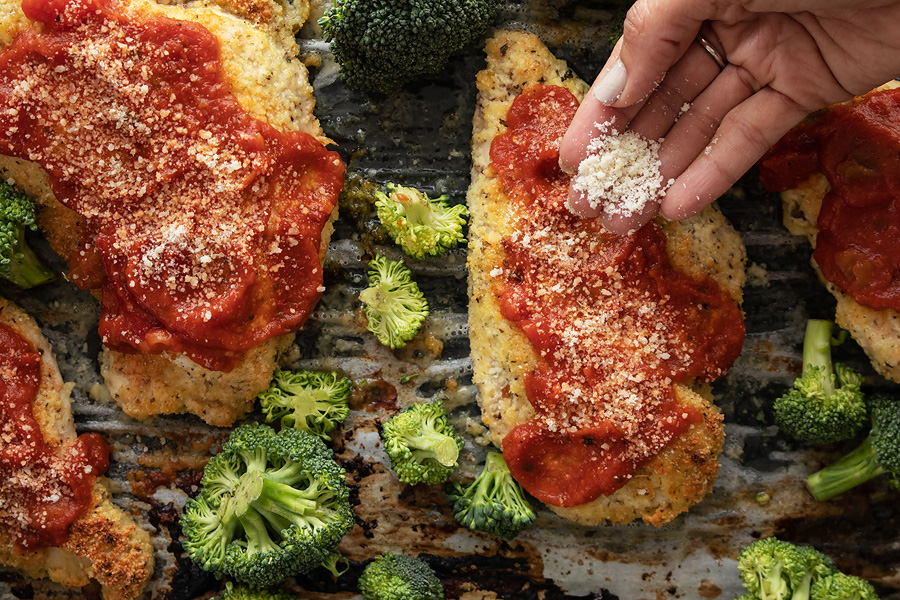 Whether you’re getting home from work, the gym, or errands — having a meal that you can whip up in 30 minutes can make or break the evening. This sheet pan chicken parmesan hits the spot and is ready to go in no-time — no high-carb breading required.