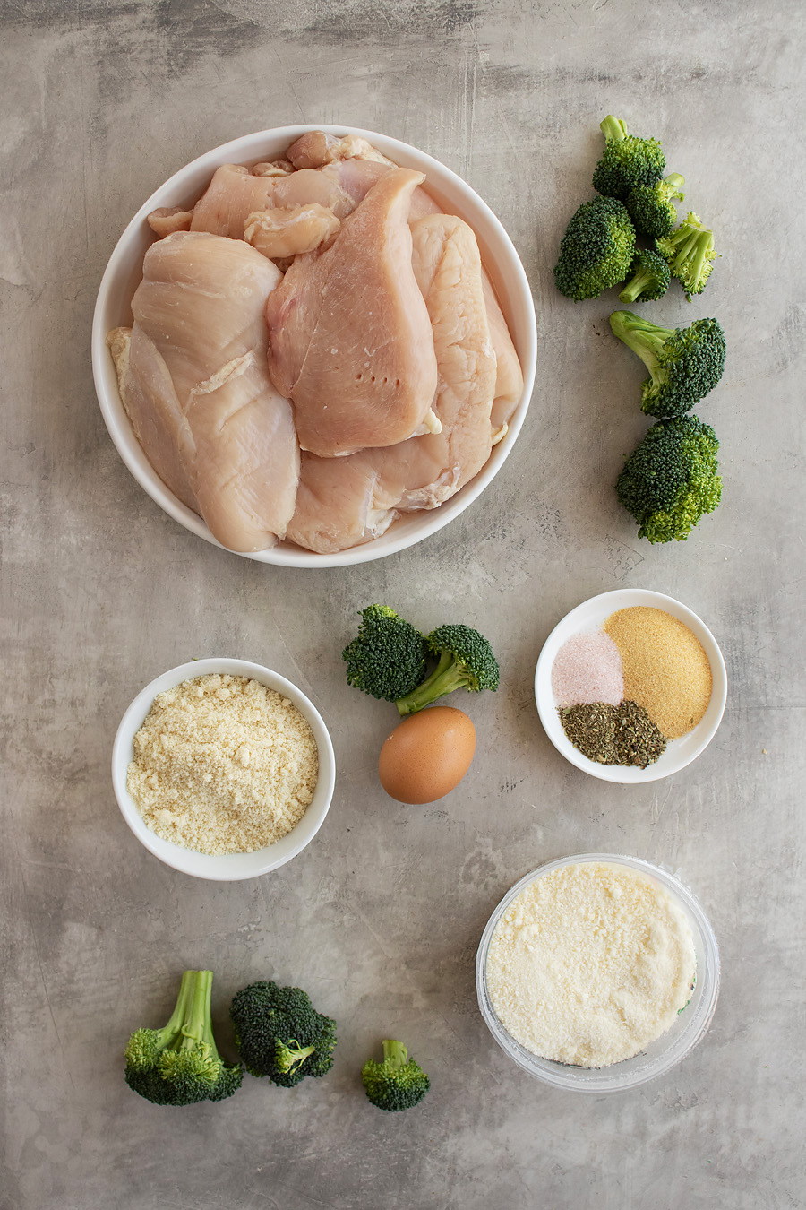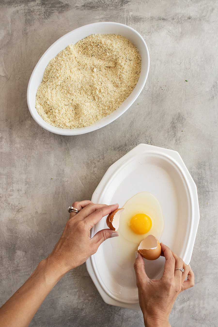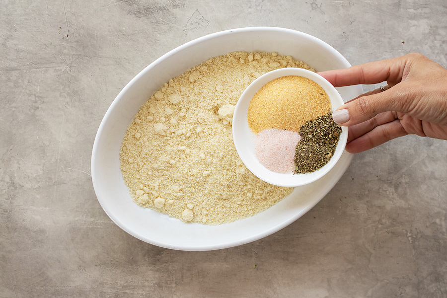 - Add almond flour, parmesan cheese, 1 teaspoon salt, pepper, garlic powder, and Italian seasoning to a shallow dish. Mix well to combine. Add egg to a separate dish and whisk well.