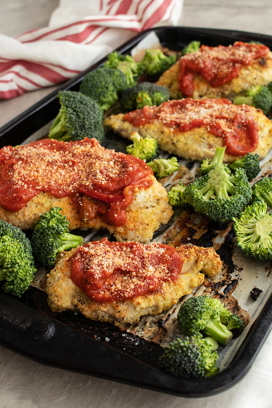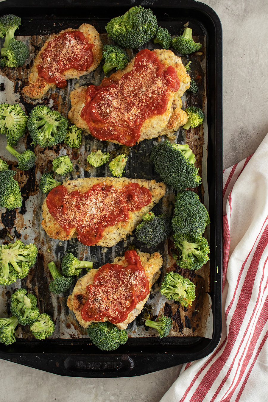 This Italian sheet pan parmesan chicken is a fantastic weeknight dinner recipe. Crispy chicken breasts coated in parmesan cheese served with a side of veggies.