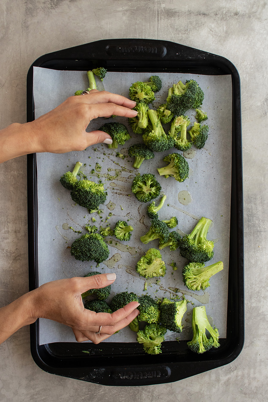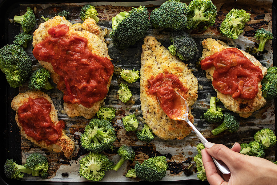 - Bake for 10 minutes and remove from oven. Add broccoli. Drizzle olive oil and remaining ½ teaspoon salt over broccoli. Toss well to coat. Add marinara sauce and extra parmesan cheese to the tops of each chicken breast.