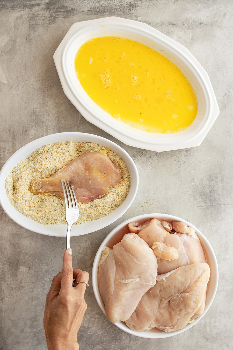 - Coat chicken breasts in egg mixture, then almond flour mixture. Place on baking pan.