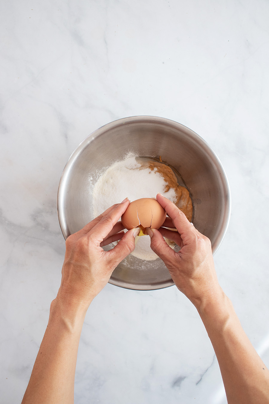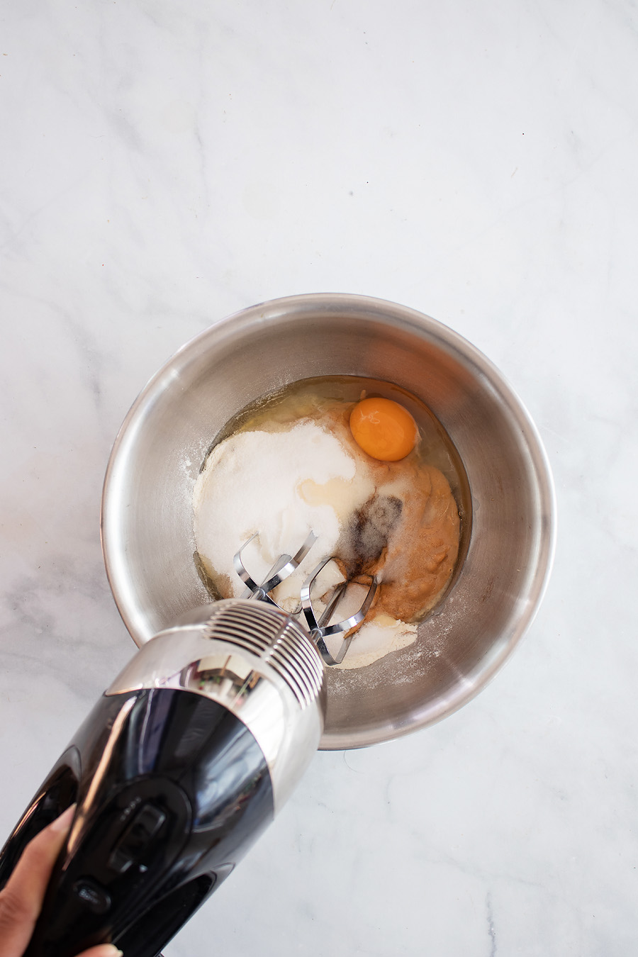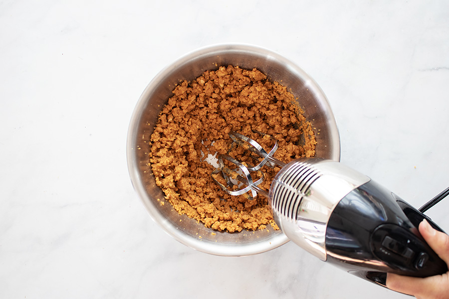 Next, in a large mixing bowl, add all your ingredients (collagen, natural pb, egg, vanilla extract, and powdered sweetener) and mix until well incorporated.