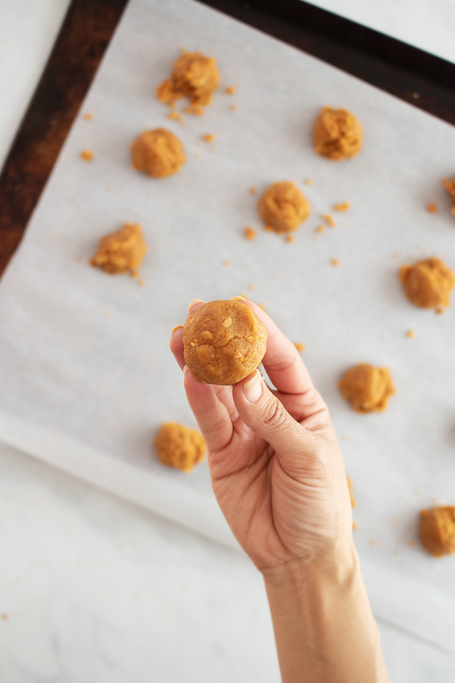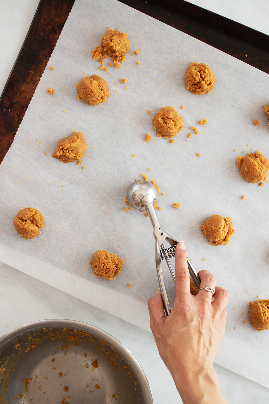 Grab your cookie sheet and roll the cookie dough into small 1-inch balls or use a cookie scoop, making sure the dough balls are at least one inch apart.