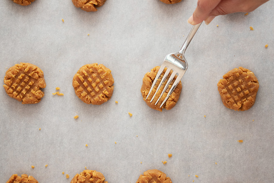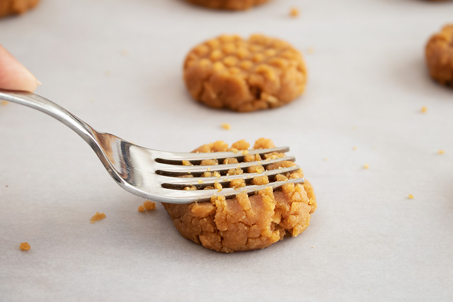 Using a fork, press the cookie dough balls into the classic criss-cross pattern. If the dough is sticky use some coconut oil or avocado oil on your hands.
