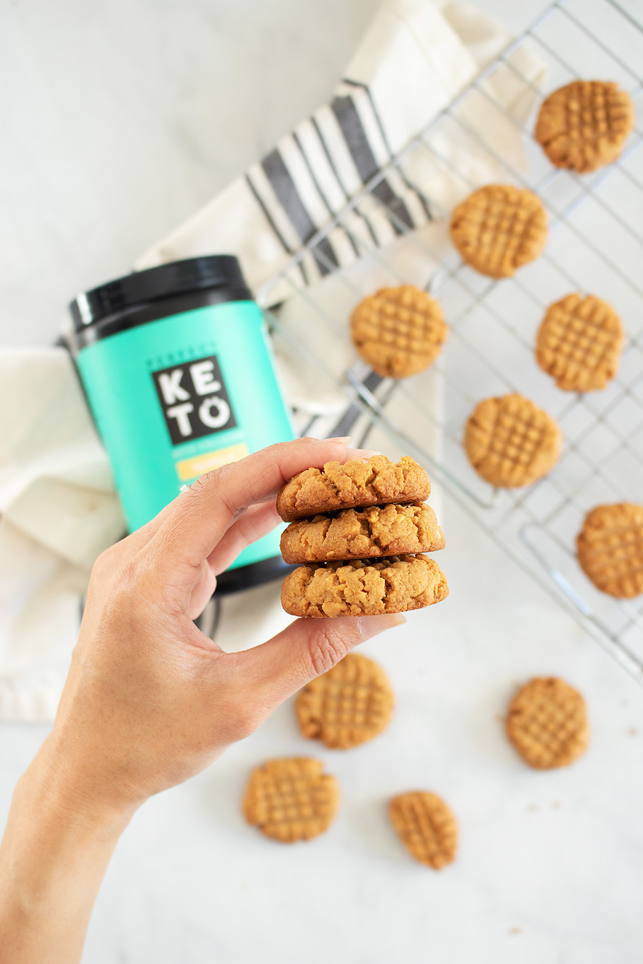 This keto peanut butter cookies recipe is gluten-free, and contains no added sugars or artificial ingredients. The recipe calls for monk fruit and natural PB.