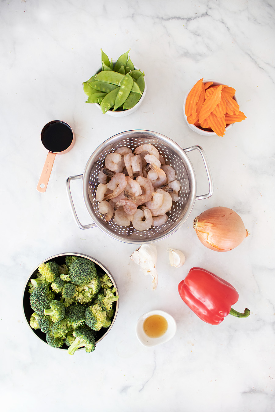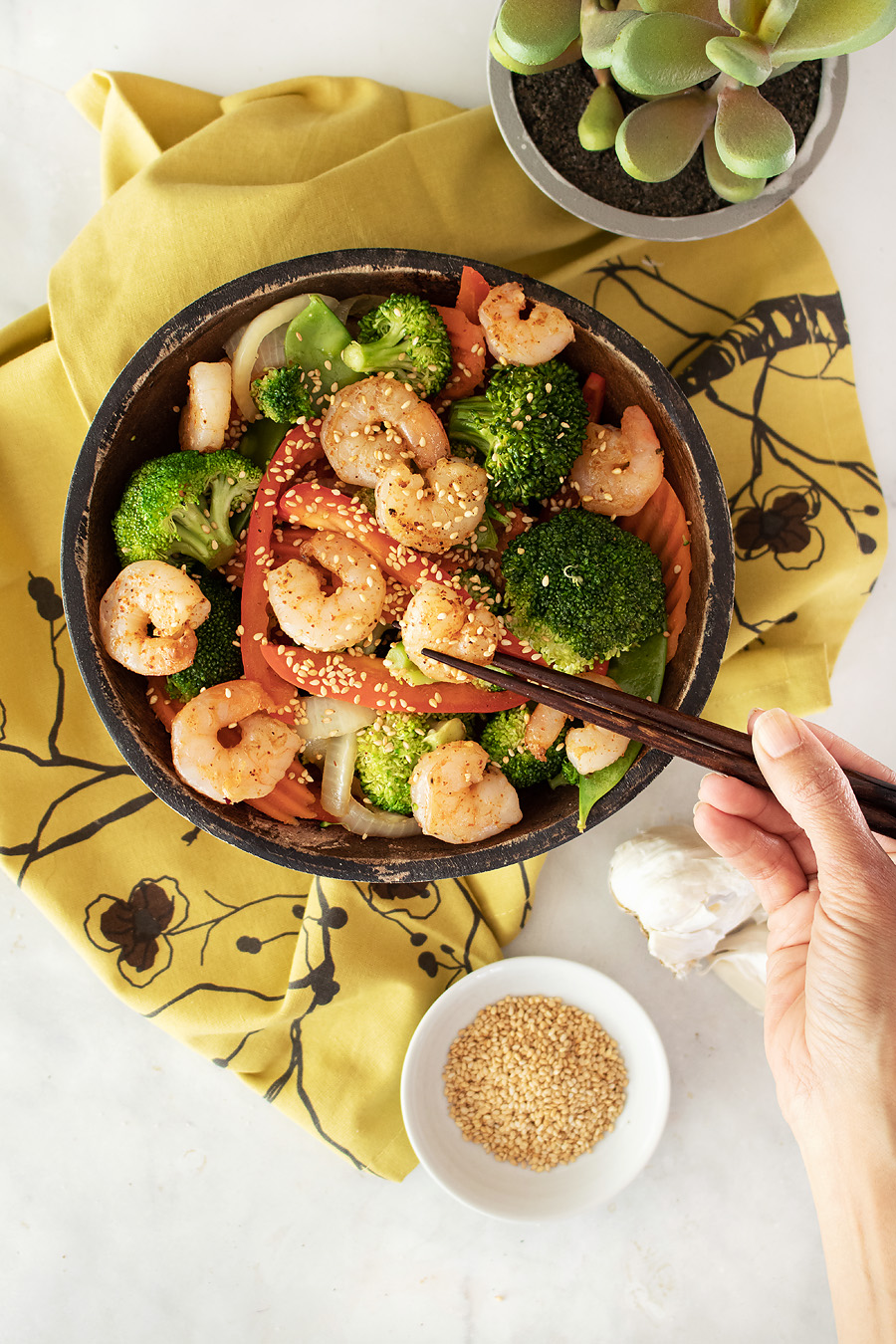 Low on other veggies in the house? Make it easy and just use broccoli, onions, and garlic. Add 1 tablespoon of avocado oil and roughly chopped broccoli to a large pan or wok set over medium-high heat. Cook for 5-6 minutes until tender. While vegetables are cooking, make sauce by adding coconut aminos, rice wine vinegar, ginger, xanthan gum, remaining salt & pepper, and red chili flakes. Whisk to combine. Add to vegetables and stir. Increase the heat to high and toss in shrimp. Cook for 4-5 minutes until shrimp is pink and cooked through.