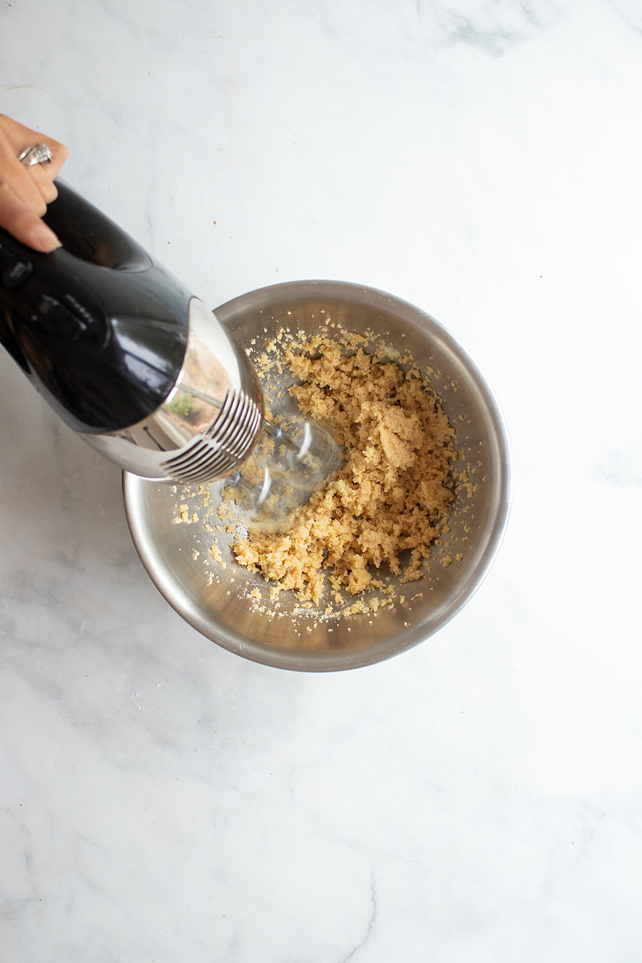 - Add butter and ⅓ cup sweetener to a large bowl or stand mixer. Beat for 1 minute until light and fluffy. Add egg and vanilla extract. Mix until well combined.