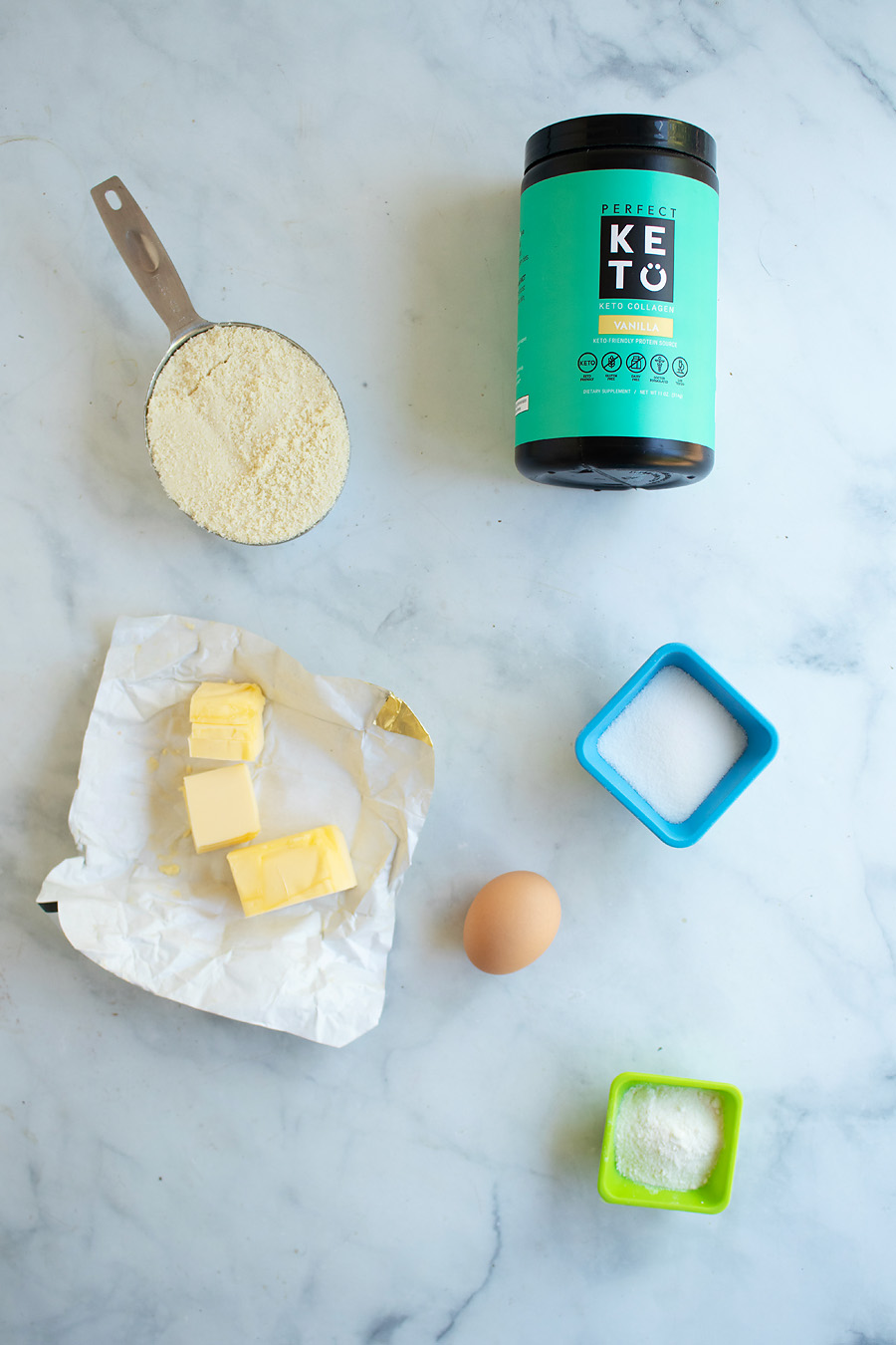 - Add collagen, almond flour, coconut flour, baking powder, ¼ cup sweetener, and salt to a medium-sized bowl. Whisk well until combined.
