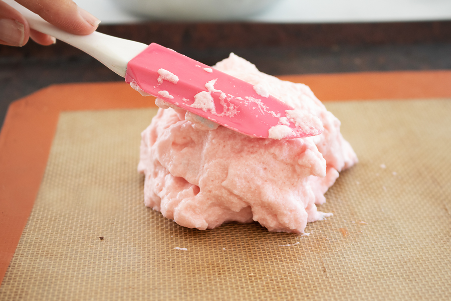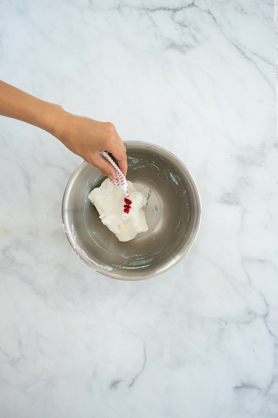 - Slowly sprinkle in arrowroot or cornstarch and beat until mixture retains stiff peaks. You can also add a couple of drops of food coloring if you like.