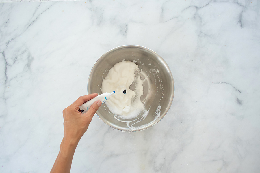 Slowly sprinkle in arrowroot or cornstarch and beat until the mixture retains stiff peaks. You can also add a couple of drops of food coloring at this point.