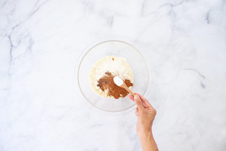 Next, in a large bowl, combine your dry ingredients: almond flour, coconut flour, baking soda, pumpkin spice, nutmeg, allspice, ginger, cinnamon, ground cloves, and salt.